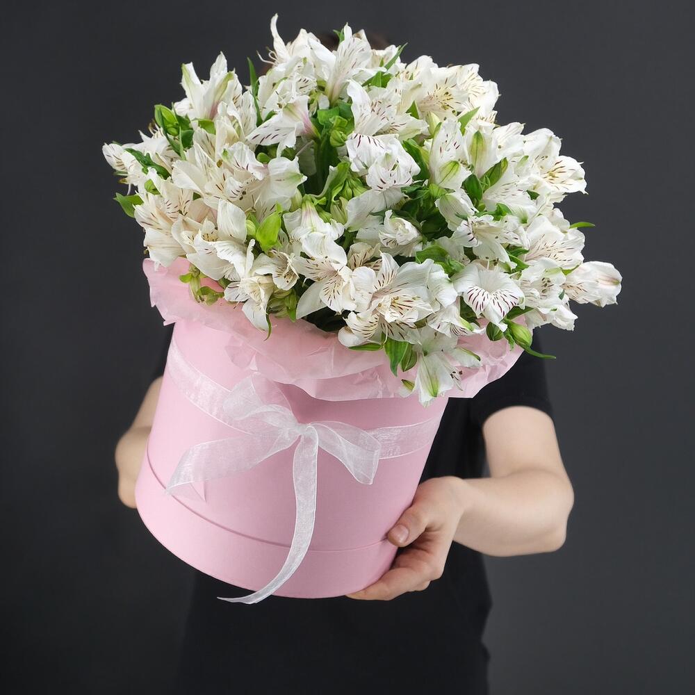Альстромерия - 11 шт. Шляпная коробка - 1 шт. подкормка для срезанных цветов - 1 шт. инструкция по уходу за цветами - 1 шт.
